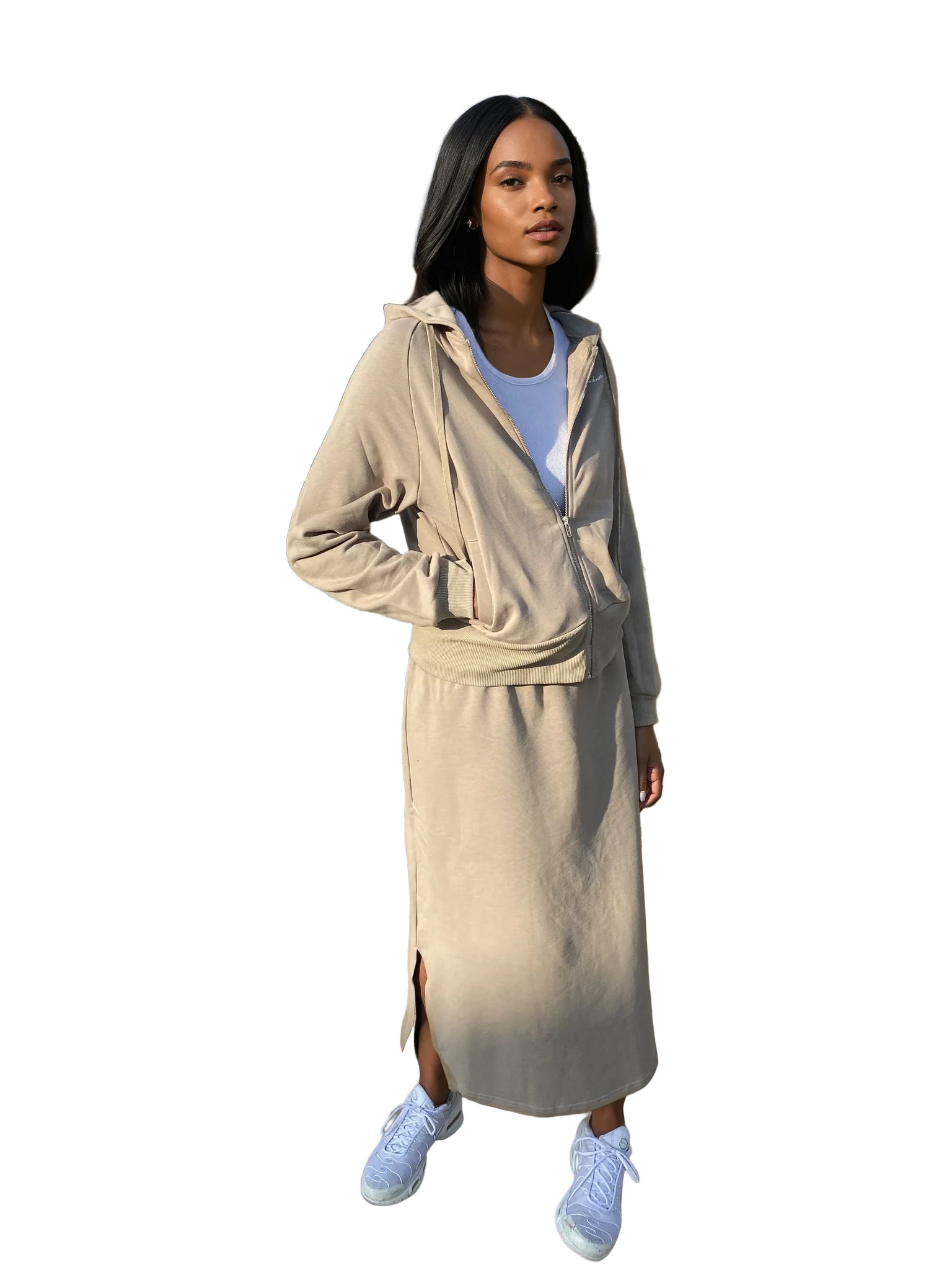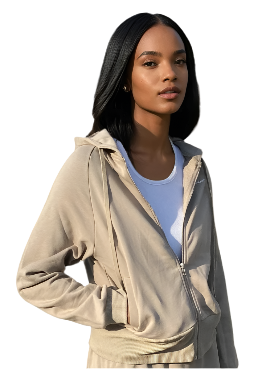 Zip-Up Hoodie: Lightweight and cozy with a relaxed fit, drawstring hood, full zipper front, and side pockets for added functionality.